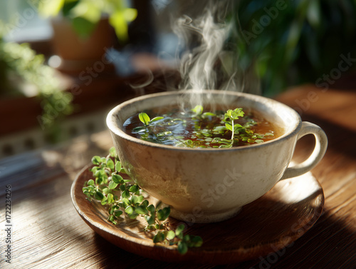 Steaming herbal tea with fresh thyme in rustic cup