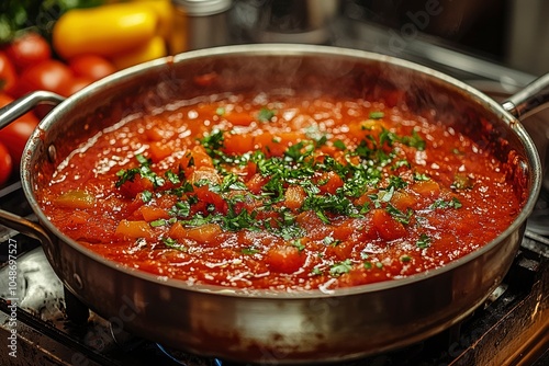 pot, sauce, tomatoes, red, herb, green, parsley, simmering, steam, cooking, kitchen, food, meal, dish, dinner, epicure, favor, fresh, aromatic, fragrant, delicious, savoury, simmer, liquid, hot, heat, burner, flavorful, cookery, gastronomy, culinary
