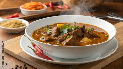 Steaming Spicy Beef Stew with Potatoes and Cilantro Served with Carrots and Chili Peppers on Wooden Tray