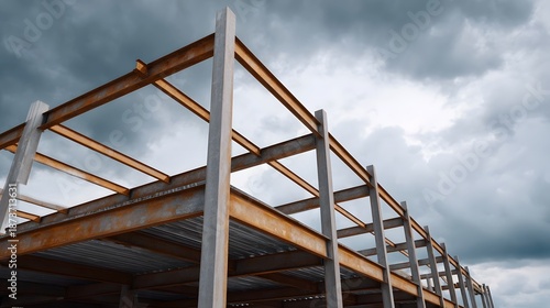 steel, frame, building, construction, cloudy, sky, beam, column, architecture, industry, structure, development, progress, engineering, unfinished, metal, concrete, framework, site, project, growth, material, cloud, overcast, weather, industrial, urban, exterior, design, support, skeletal, future, raw, iron, oxide, rust, weathered, perspective, angle, daylight, grey, moody, heavy, erection, assembly, process
