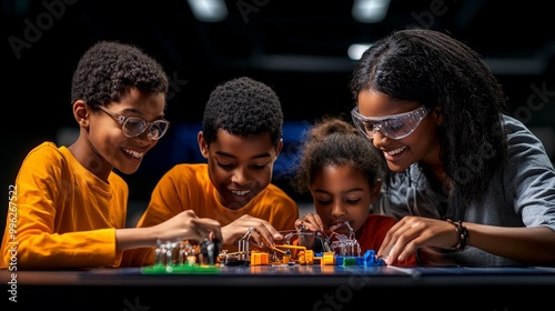 STEM Education: A Joyful Learning Experience: A close-up photo of an African American teacher and three students engaged in an exciting STEM activity.
