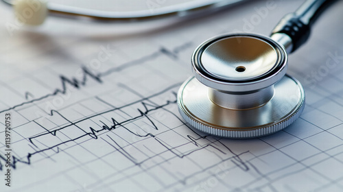 Stethoscope on a medical chart with an ECG line, a close-up shot