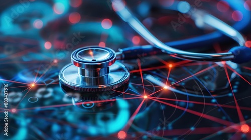 Stethoscope on digital background with neural network graphics, symbolizing the intersection of healthcare and technology.