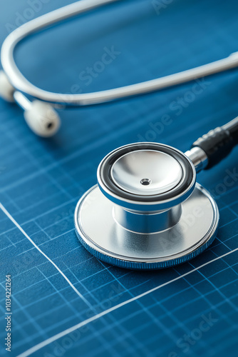 Stethoscope on medical blueprint background.