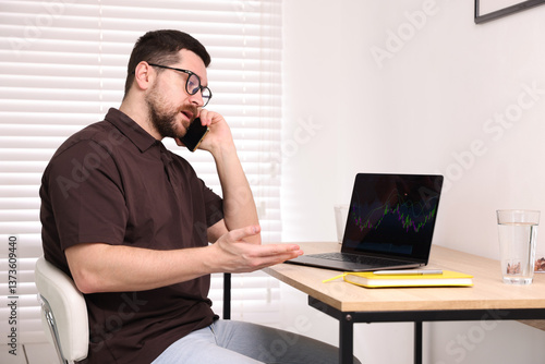Stock exchange. Man talking on smartphone at desk indoors