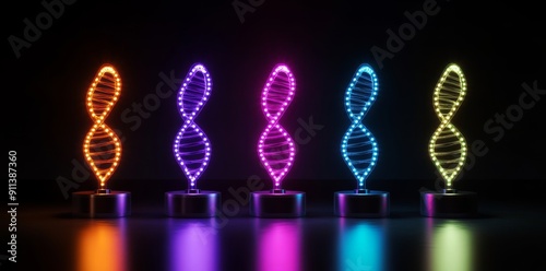 Stock image of glowing DNA helix in dark void. The design inspires emotions in genomics and medical research, and suits biotech and genetic startups.