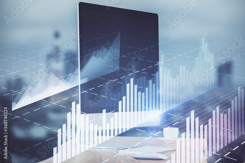 Stock market graph on background with desk and personal computer. Double exposure. Concept of financial analysis.