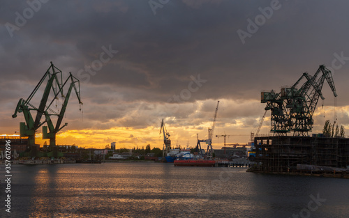 dockyard, port, sea, danzig, dock, industry, to entertain, crane, container, industrial, transport, water, heaven, transportation, sundown, business, haulage, boat, loading, export, river
