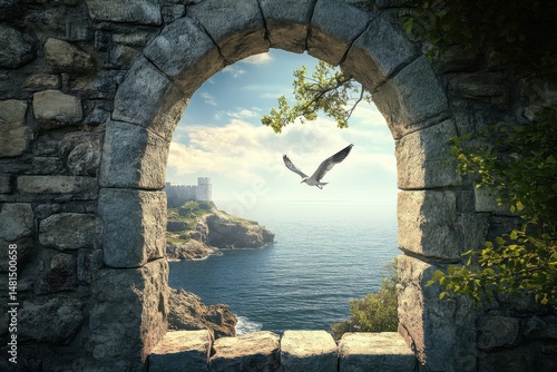Stone Castle. Ancient Fortress Tower Window with Blurred Bird and Sea View