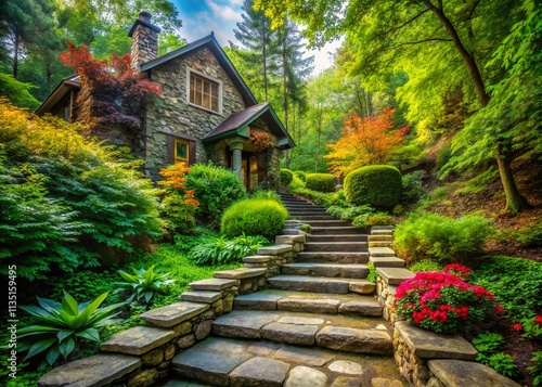 Stone Steps Leading to a Cozy House in the Woods, Ideal for Landscaping and Outdoor Living Content, Showcasing Nature's Beauty and Home Design Inspiration for Brochures and Articles