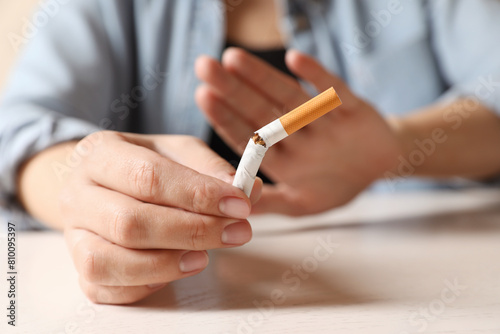 Stop smoking. Woman holding broken cigarette at table, closeup