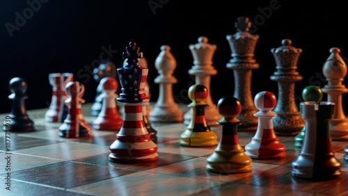 Strategic geopolitical chess game concept featuring USA and Middle Eastern flags. Ideal for news broadcasts, political analysis articles, diplomatic strategy reports, and international relations blogs