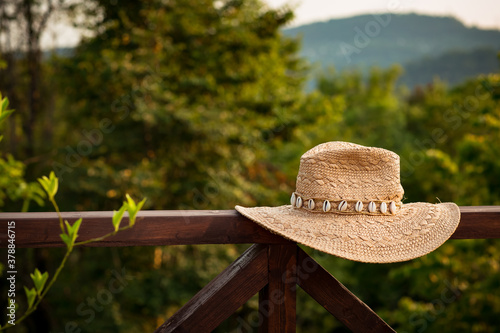 straw hat made of eco-friendly material, lying on the background of nature and mountains