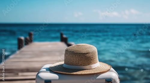 Straw Hat Resting on Cooler by a Tranquil Ocean View Pier