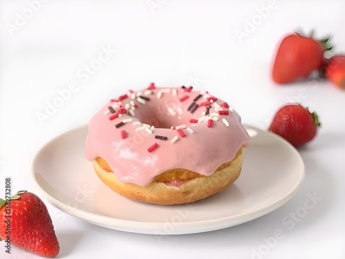 Strawberry frosted donut with colorful sprinkles on white plate, surrounded by fresh strawberries, perfect for bakery advertisements, dessert menus, sweet treat promotions, food blogs, and social
