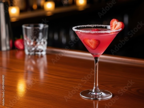strawberry, martini, cocktail, bar, counter, drink, alcohol, beverage, glasses, fruit, red, pink, sweet, tasty, delicious, barkeeper, wood, table, light, bokeh, background, pub, club, party, night, evening, lifestyle, relaxation, social, date, valentine, romance, love, celebration, luxury, elegant, classic, spirit, liqueur, vodka, gin, garnish, rim, sugar, ice, cold