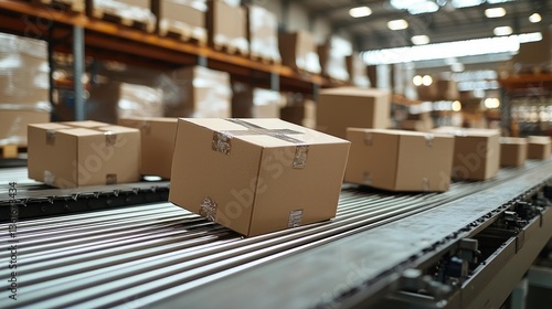 Streamlined Cardboard Box Movement on a Conveyor Belt in a Busy Warehouse