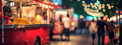 Street Food Fest: A bustling scene of a vibrant food truck at night, filled with tempting culinary delights under the warm glow of string lights.