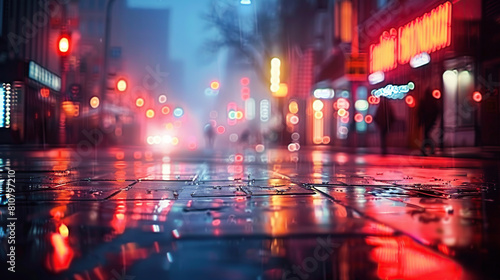 Street photograph, a nighttime urban scene with triad colors of indigo, chartreuse, and tangerine. Apply a bokeh lens for dreamy lights. Generative AI