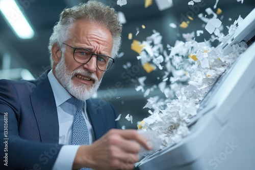 businessman, printer, malfunction, paper, office, stressed, chaos, shredding, technology, work, corporate, problem, workplace, frustration, error, machine, confusion, issue, older, male, suit, goggles, document, panic, expression, business, printing, indoor, equipment, troubleshooting, complication, mess, hardware, unsuccessful, pressing, urgent, startled, task, breakdown, unexpected, shock, management