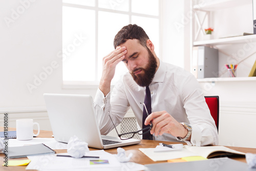 adult, business, businessman, tied-up, caucasian, computer, corporate, desk, digital, executive, photogenic, horizontal, indoor, interior, cyberspace, job, laptop, leader, lifestyle, male, man, modern, occupation, office, 1, people, person, portrait, professional, serious, table, technology, white, work, men at work, workplace, young, bearded, eyeglass, problem, sleepy, concentrated, hard-working, pensive, thinking, formal