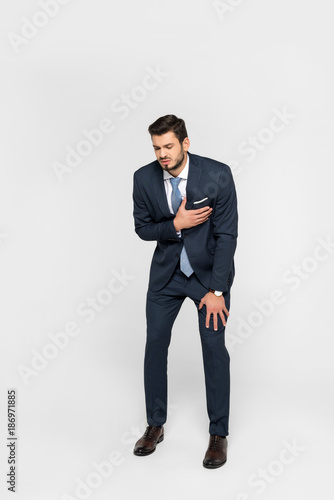 stressed overworked businessman having heartache isolated on grey