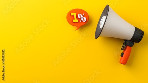 Striking 3D megaphone and speech bubble with a vibrant percentage symbol floating effortlessly on a solid yellow background This image is perfect for use in advertising marketing and sales campaigns