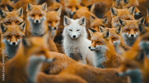Striking albino fox amidst surrounding foxes