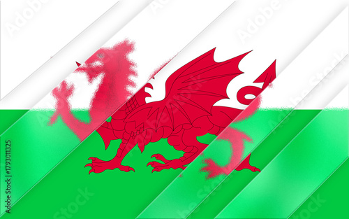 Striking depiction of the flag of Wales with a vivid red dragon emblem layered across white and green stripes, presented in a modern, stylized design with diagonal glass-like textures.