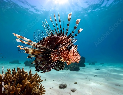 Striped lionfish swims above sandy seabed, coral, sunlight filters through clear turquoise water