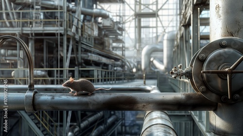 Structural details of a modern industrial building with a realistic mouse scurrying along a pipe.