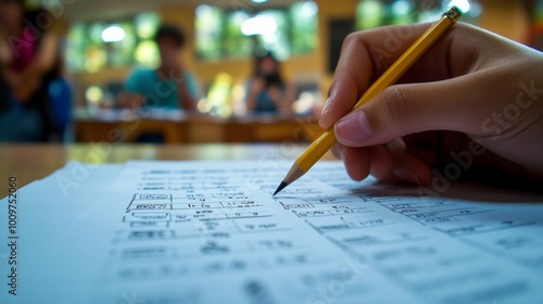 Student using a pencil to fill out a questionnaire at a desk during an afternoon study session