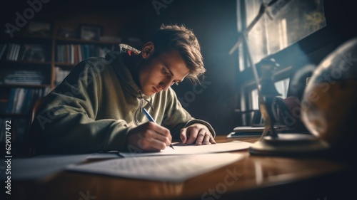 students writing essays, solving equations, or engaging in academic writing, emphasizing the role of writing in academic pursuits and knowledge acquisition