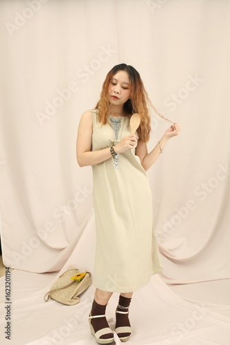 Studio lookbook with vintage dresses, soft lighting, and feminine styling on a plain backdrop.