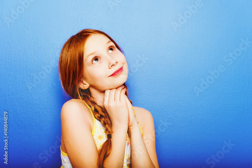 Studio shot of young preteen 9-10 year old redhead girl wearing yellow top, standing against blue purple background, looking up