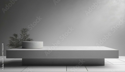 Studio with podium for product presentation. Empty floor and white wall with stand. 3D room with gradient background. Countertop with concrete or marble texture