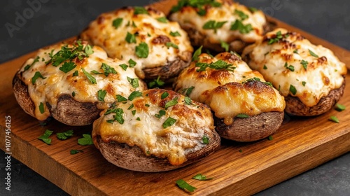 Stuffed mushrooms topped with melted cheese and garnished with fresh parsley on a wooden board, prepared as an appetizer.