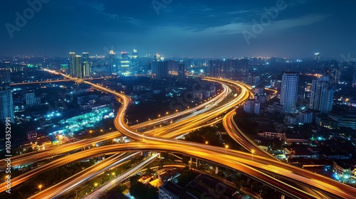 Stunning aerial view of illuminated highway light trails at night, showcasing dynamic movement and urban landscape. Perfect for concepts of speed, transportation, and modern infrastructure.