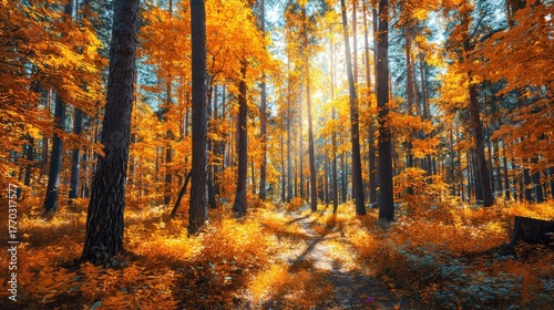 Stunning Autumn Forest Scene with Vibrant Orange Foliage and Sunlight Filtering Through Pine Trees in a Serene Natural Landscape