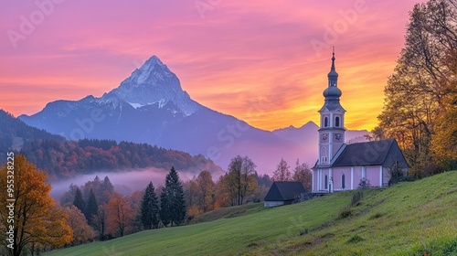 Stunning autumn sunrise in Bavaria, featuring Maria Gern Church with the majestic Hochkalter Peak towering behind