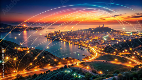 city, sunset, network, light, aerial, view, water, landscape, urban, technology, connection, night, illumination, skyline, transportation, harbor, hill, communication, infrastructure, beauty, vibrant, scenic, coast, travel