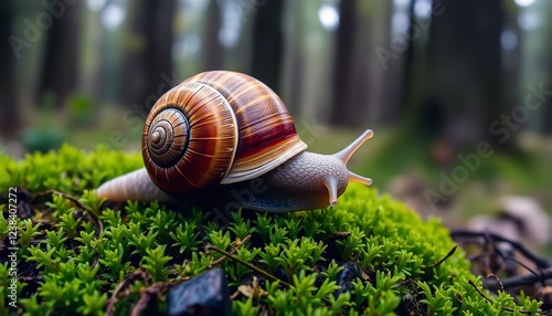 Stunning Close-Up of a Grove Snail on Moss in a Forest Setting; Vibrant Shell, Nature Photography, Wildlife
