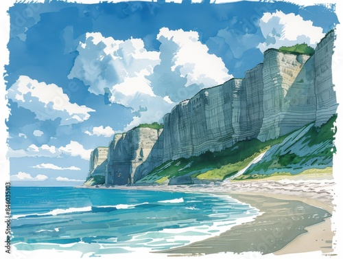 beach, cliff, coastline, ocean, wave, sky, cloud, scenic, view, nature, turquoise, sea, sand, shore, vacation, travel, landscape, horizon, scenery, summer, beautiful, peaceful, serene, idylli, drawing, illustration, seascape, painting, rock, watercolor, art, picturesque, vignetting, tranquil, artwork, vacation spot, get-away, water, island, coast, rock, bay, tropical