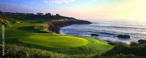 Stunning Coastal Golf Course at Sunset with Ocean View and Lush Greenery