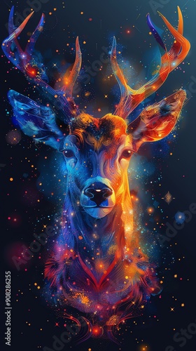 Stunning digital art of a majestic deer with vibrant, cosmic colors and glowing effects on a dark background.