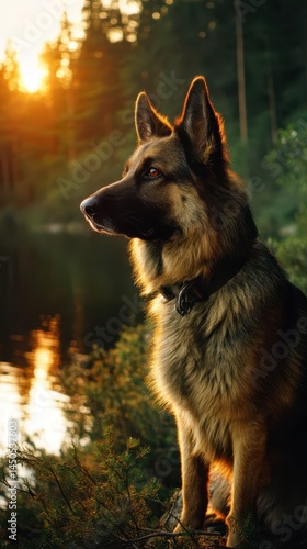 Stunning German Shepherd at sunset by a tranquil lake.