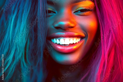 Stunning happy black girl - for ads, marketing material and internet banner use. Long haircut - multicolored hair. Commercial commercial creative art. Stylish black hair concepts.