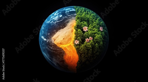 Stunning Illustration of Earth Split Between Fiery Landscape and Lush Green Forest Representing Nature's Duality and Balance