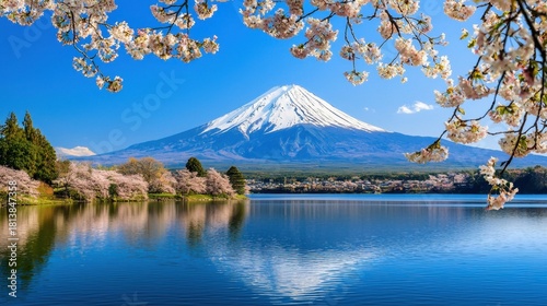 Stunning Mount Fuji with Cherry Blossoms and Calm Lake View