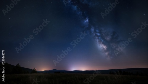 Stunning night sky scene shows Milky Way galaxy stretching across starry night sky above silhouette landscape. Silhouette of distant mountains, grasses form horizon. Cosmic view of beautiful night